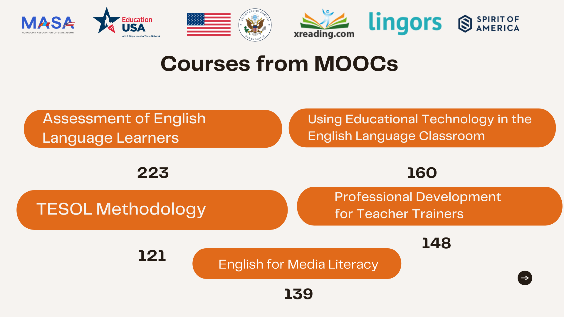 Хөтөлбөрийг хамтран зохион байгуулсан АНУ-ын Элчин сайдын яам, Spirit of America, Лингорс, Xreading-ийн хамт олон болон багш нарт хувь хүний хөгжлийн сургалт орсон Ганабелл Институт болон бусад хамтран ажилласан хувь хүн, албан байгууллагуудад Монгол дахь Америкт Төгсөгчдийн Холбоо (MASA) болон EducationUSA Mongolia хөтөлбөрийн зүгээс талархал илэрхийлье!