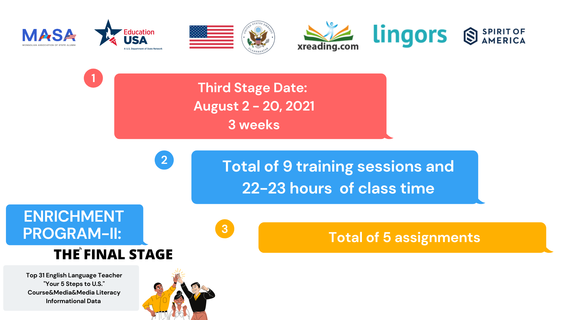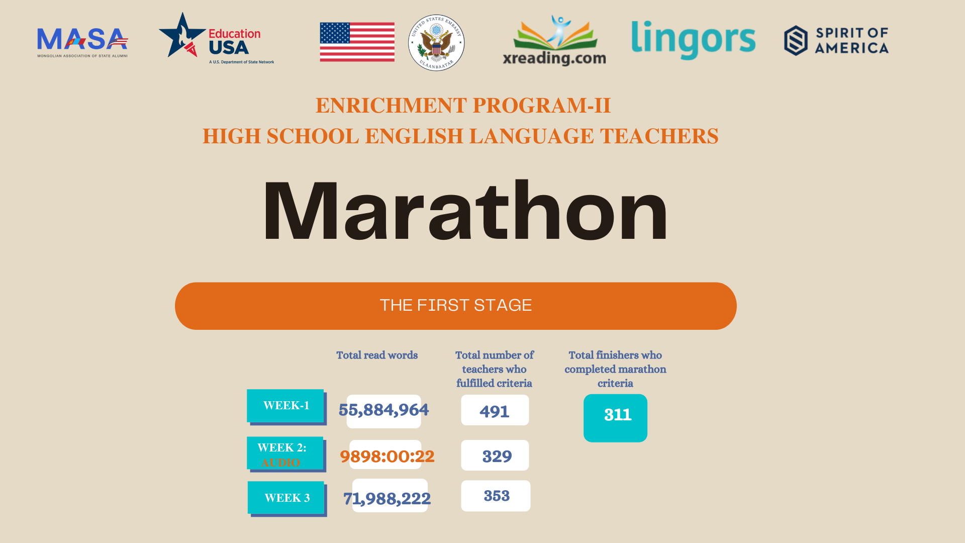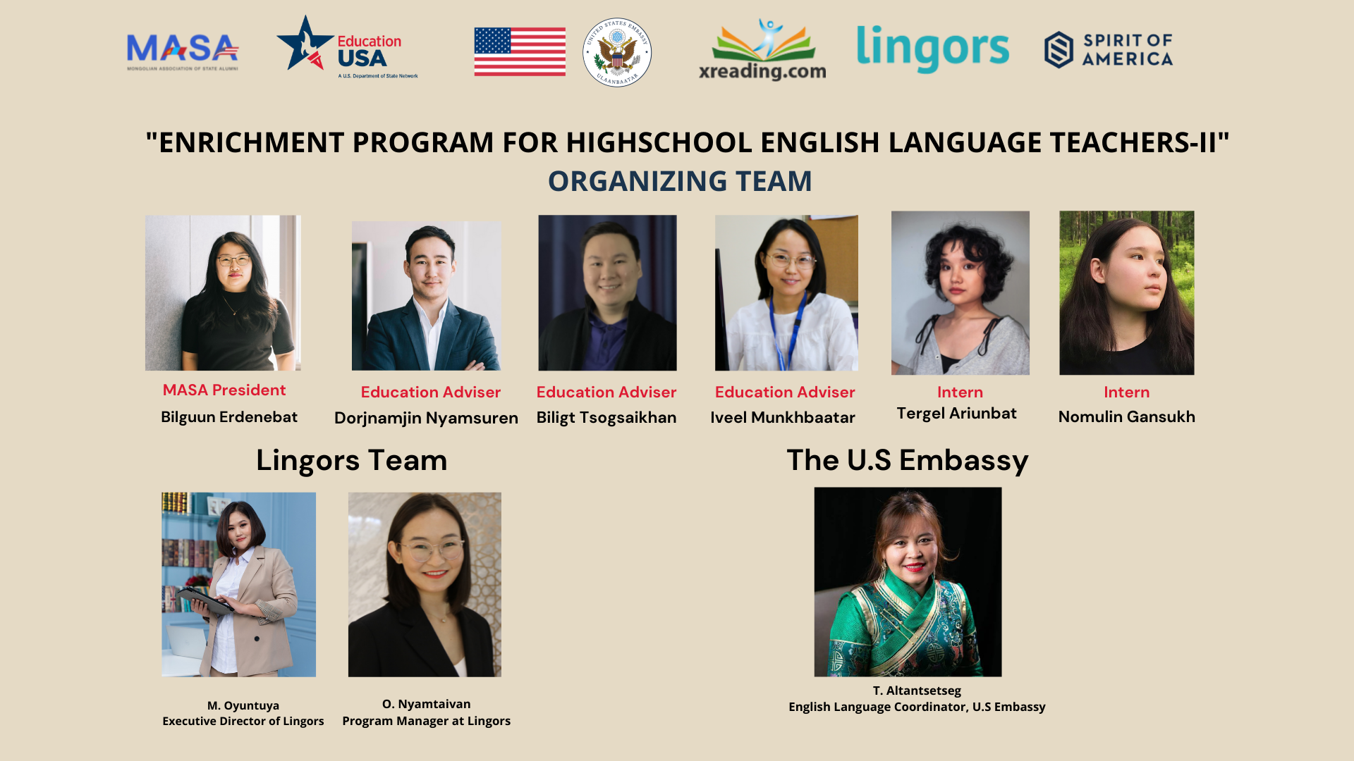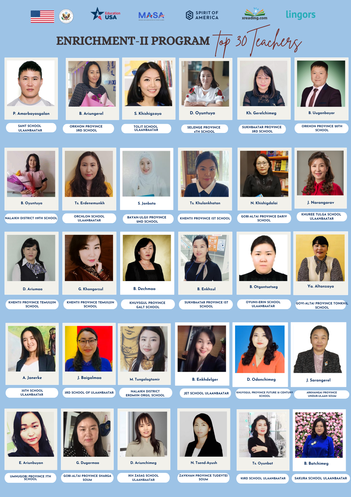 Монгол дахь Америкт Төгсөгчдийн Холбоо (MASA)-с санаачлан АНУ-ын Элчин сайдын яам, Spirit of America, EducationUSA Mongolia хөтөлбөр, Лингорс, Xreading цахим номын сангийн Монгол дахь төлөөлөгч байгууллага хамтран улсын болон хувийн бүх Ерөнхий боловсролын сургуулийн Англи хэлний багш нарт зориулан зохион байгуулсан "ENRICHMENT-II" хөтөлбөр 2021 онд хоёрдахь удаагаа амжилттай зохион байгуулагдаж өнөөдөр хөтөлбөрийн хаалтын ёслолын арга хэмжээ болж өндөрлөлөө.