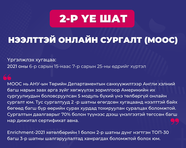 Мөн та энд дарж 2-р шатны MOOCs-ийн талаар хийсэн мэдээлэл өгөх лайвыг үзэх боломжтой.