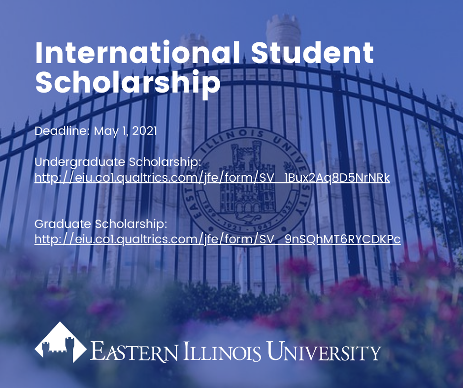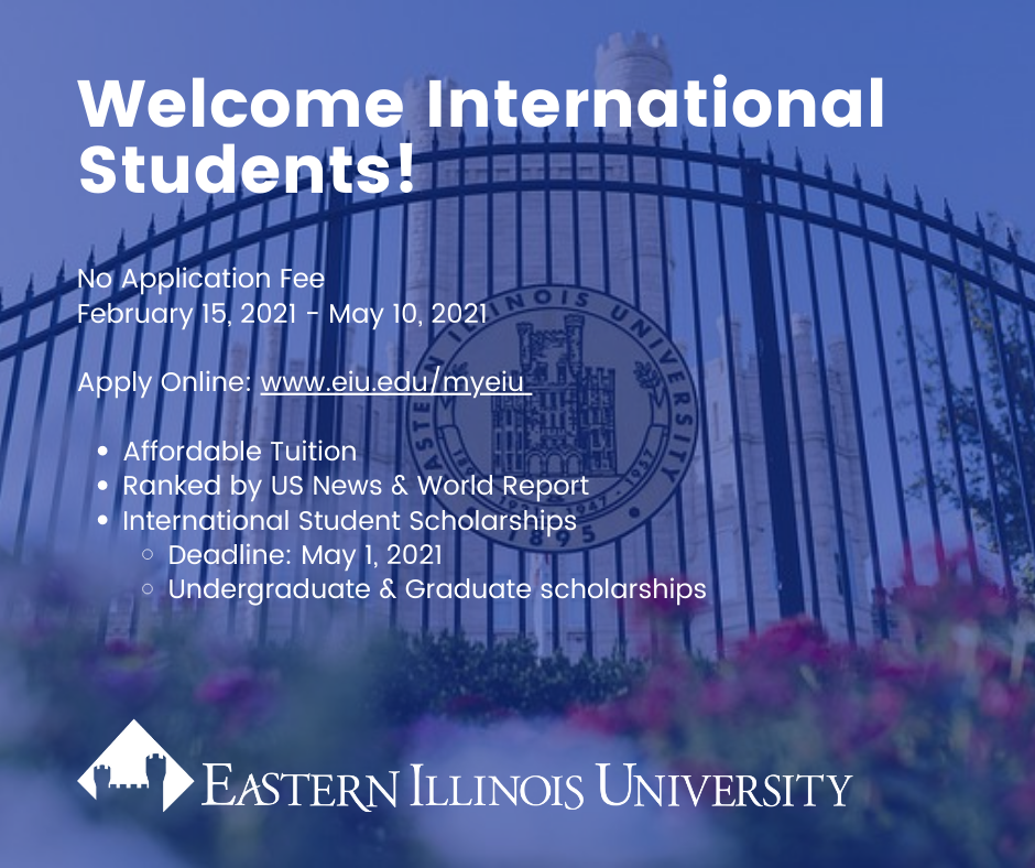 Eastern Illinois Universityнь 2021 оны намрын элсэлтэд өргөдөл гаргагчдаа өргөдлийн материал илгээх төлбөрөөс чөлөөлсөн тул 5 сарын 10-наас өмнө амжиж үнэ төлбөргүй өргөдлийн материалаа илгээгээрэй.
