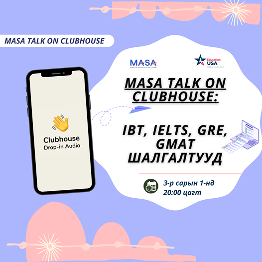 Бид Америкт сурахтай холбоотой, сонирхолтой сэдвүүдээр MASA Talk цувралыг Clubhouse дээр зохион байгуулж Америкт сурах сонирхолтой хүмүүст мэдээлэл зөвлөгөө өгч, сонирхсон асуултад нь хариулсан юм. Өнгөрөгч долоо хоногт бид TOEFL IBT, IELTS, GRE, GMAT шалгалтад өндөр оноо авсан залуусыг зочноор урьж сонирхолтой яриа өрнүүлж туршлагаас нь хуваалцсан юм