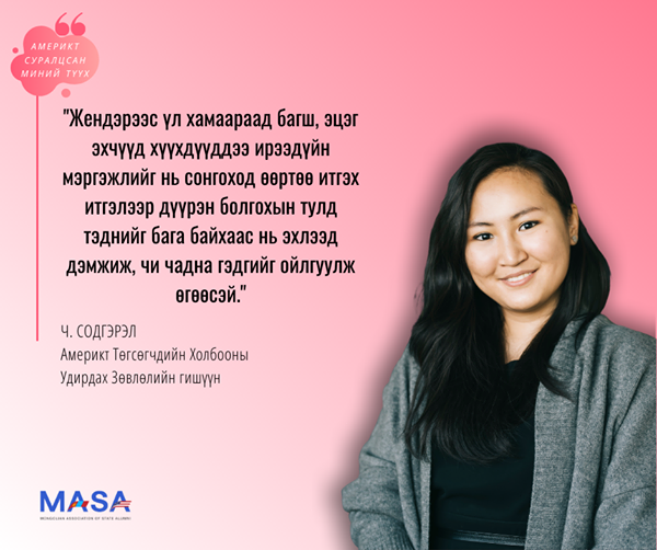Нью-Йорк мужийн их сургуулийн төгсөгч, "Рио-Тинто Монгол" ХХК-ийн Төсөл идэвхжүүлэлтийн шинжээч, MASA-ны Удирдах зөвлөлийн гишүүн Ч. Содгэрэл уригдан оролцсон подкастын дугаарыг энэ 7 хоногт та бүхэндээ зориулан нийтлэл болгон хүргэж байна. Та бүхэн ярилцлага болон дохионы хэлний орчуулгатай бичлэгийг энд дарж вэб хуудсаас үргэлжлүүлэн хүлээн авна уу.